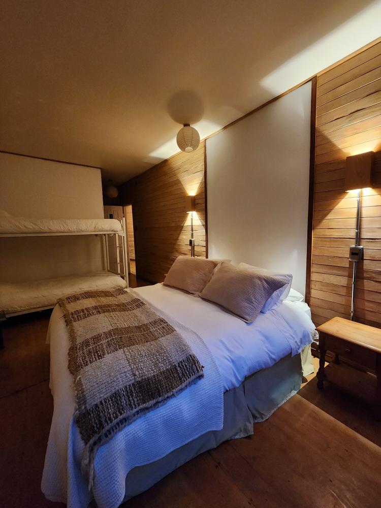 Habitación con cama doble, más litera, con vista a la calle del Barrio Palafitos de Gamboa. Incluye un exquisito desayuno con increíbles vistas al fiordo de Castro y al río Gamboa, baño privado, calefacción central y WIFI.