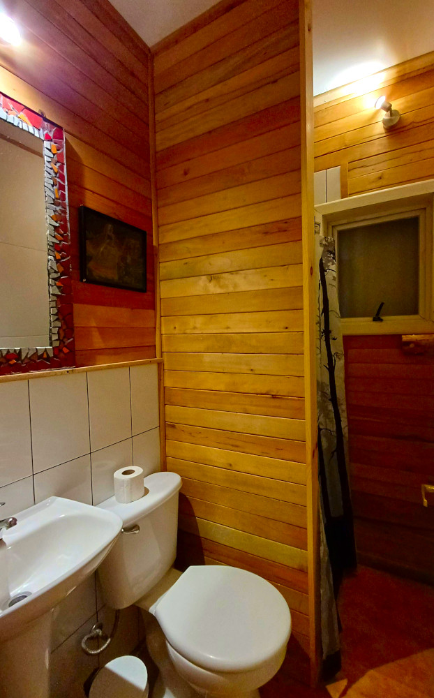 Pequeña habitación de dos pisos con cama de 1½ y pequeña litera con vista al Barrio Palafitos de Gamboa y vista parcial al mar, baño privado, escritorio y armario. Incluye un exquisito desayuno con increíbles vistas al fiordo de Castro y al río Gamboa, calefacción central y WIFI.