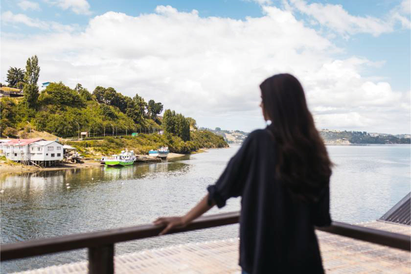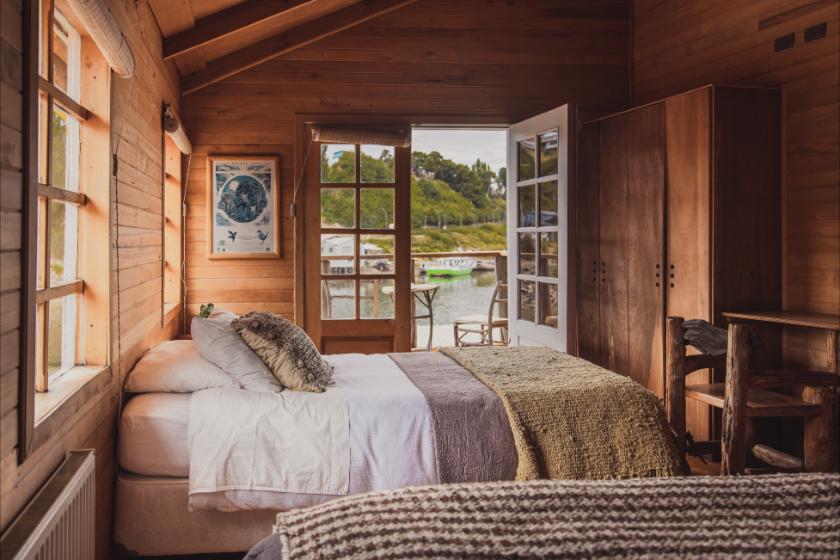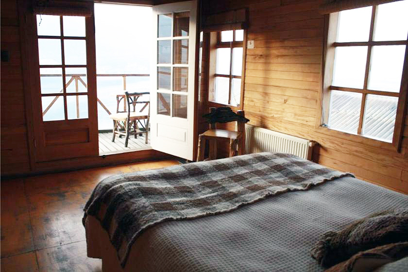 Habitación con cama doble, amplio balcón y hermosa vista frontal al mar. Incluye un exquisito desayuno con increíbles vistas al fiordo de Castro y al río Gamboa, baño privado, calefacción central y WIFI.